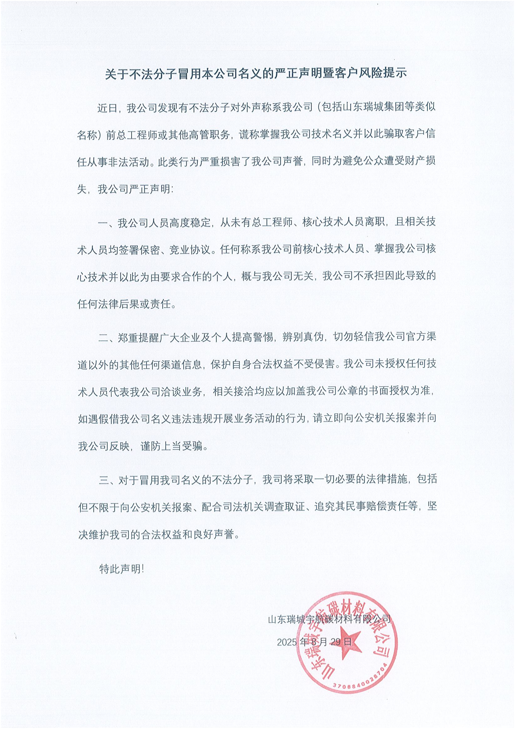 近日,我公司發(fā)現(xiàn)有不法分子對外聲稱系我公司(包括山東瑞城集團(tuán)等類似名稱)前總工程師或其他高管職務(wù),謊稱掌握我公司技術(shù)名義并以此騙取客戶信任從事非法活動。此類行為嚴(yán)重?fù)p害了我公司聲譽,同時為避免公眾遭受財產(chǎn)損失,我公司嚴(yán)正聲明: